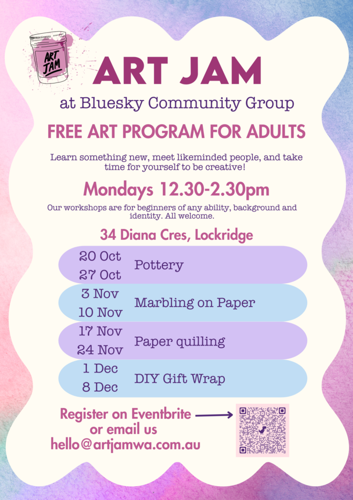 This program is generously funded and hosted by Bluesky Community Group in Lockridge. Open to adults of any age and ability, you can join any number of sessions.